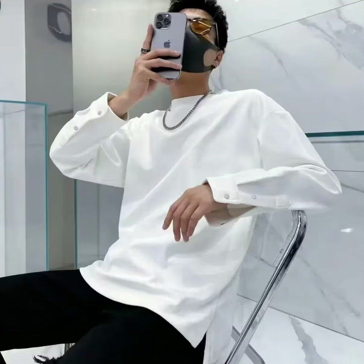 Men’s 200 Grams Heavy Cotton Long-Sleeved Base T-Shirt White Crewneck Sweater for Spring Autumn Gym Use Blank Design