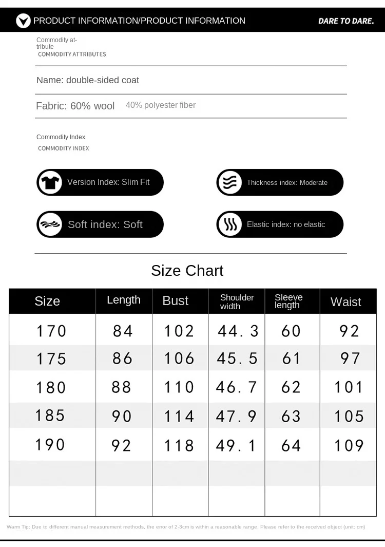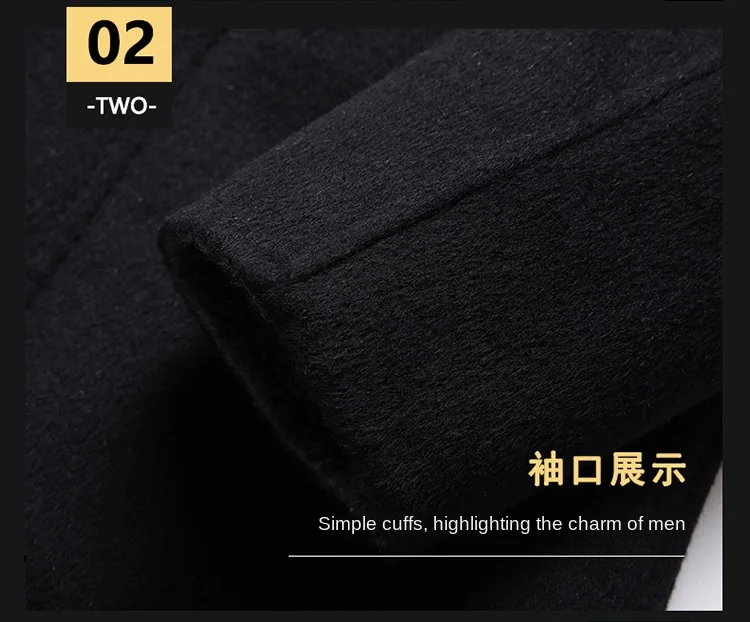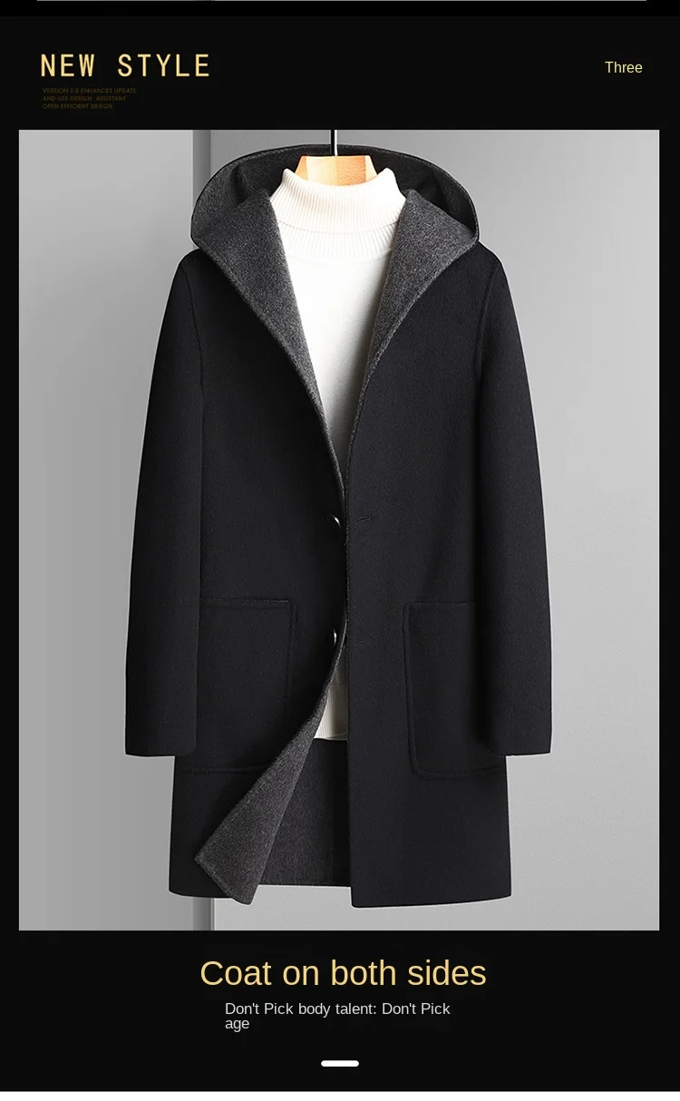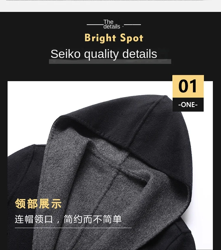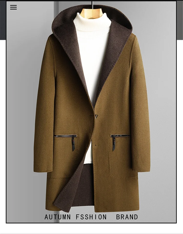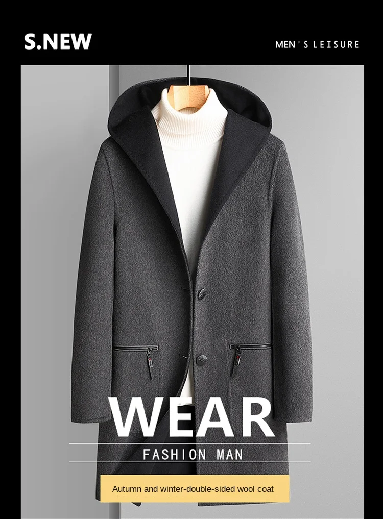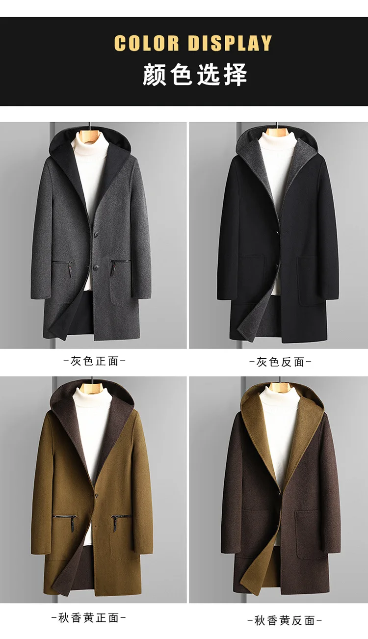 2023 Men’s Casual Mid-Length Wool Coat Handmade Double-Sided with Large Pocket and Hood Filled with Cotton