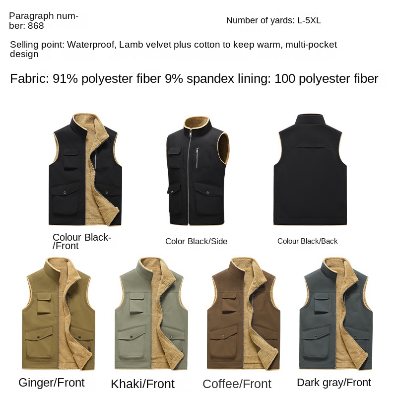 | Color | Black-lamb fleece vest, Coffee-lambskin vest, Dark gray-lamb fleece vest, Ginger-lamb fleece vest, Khaki-lamb fleece vest |