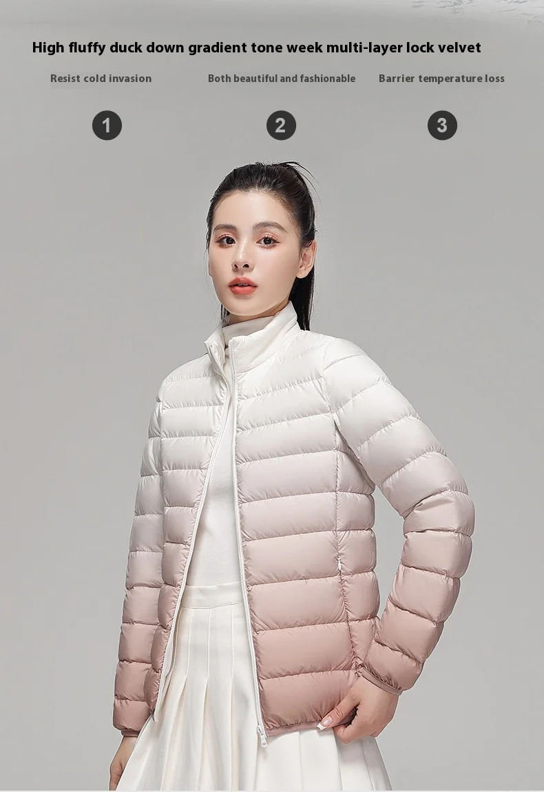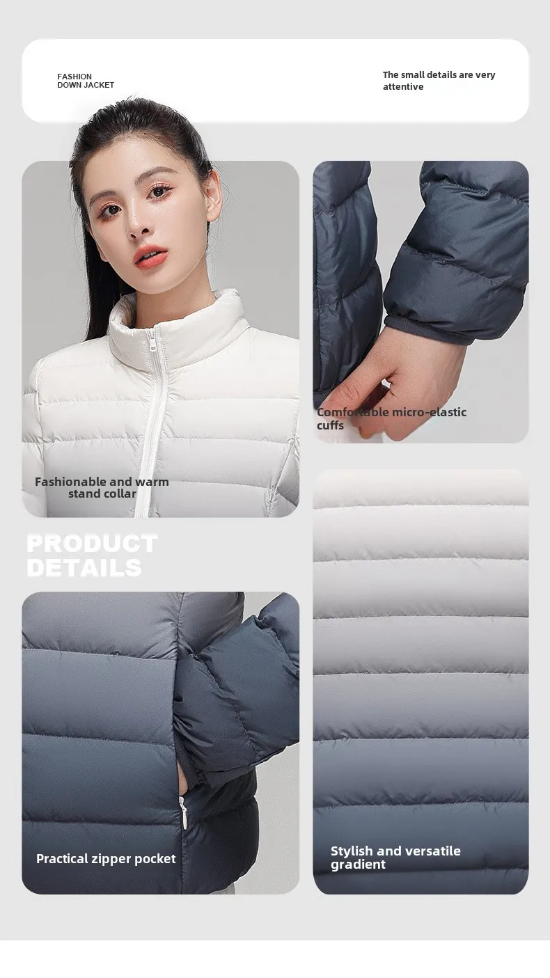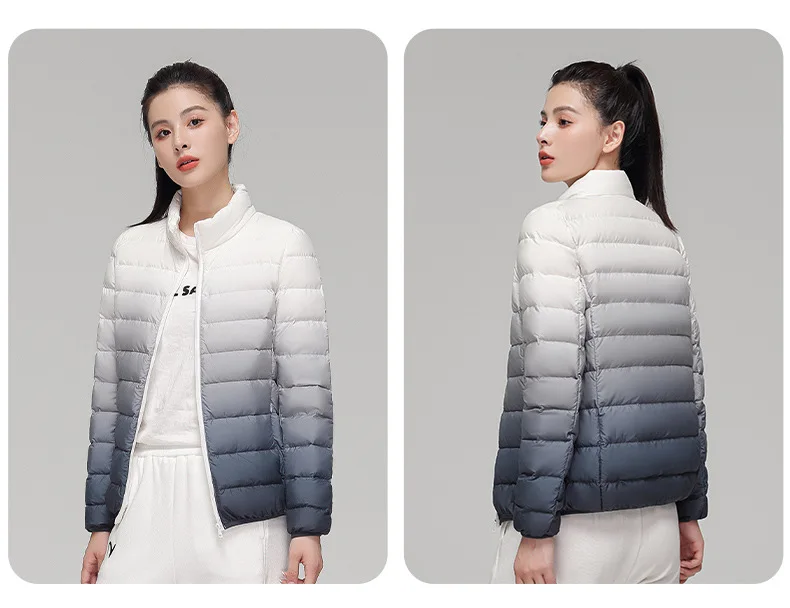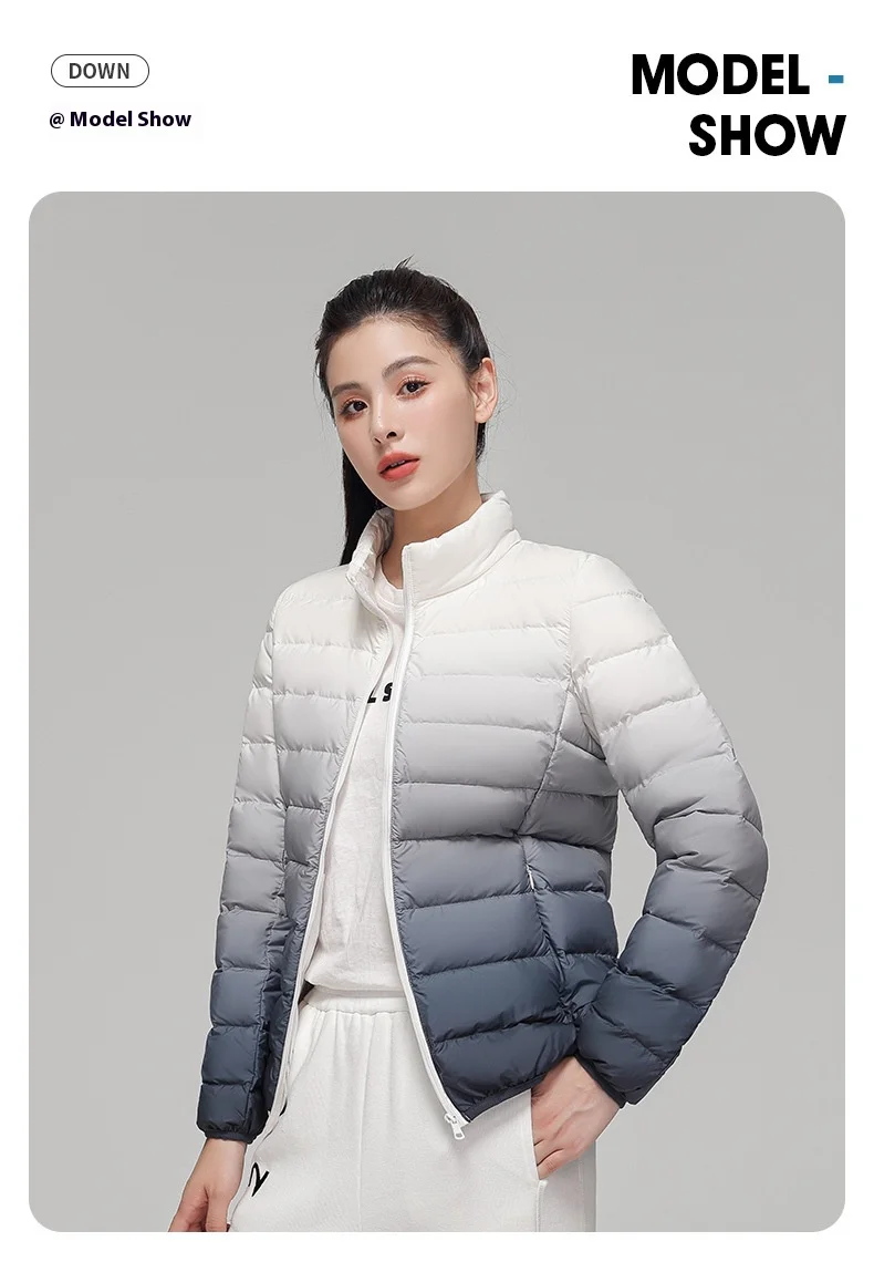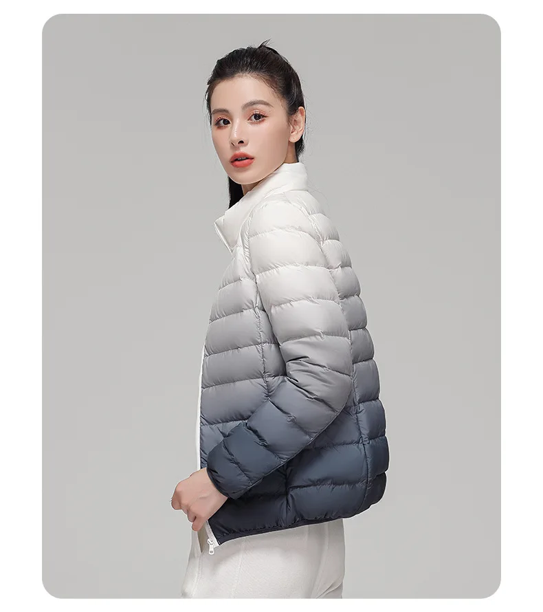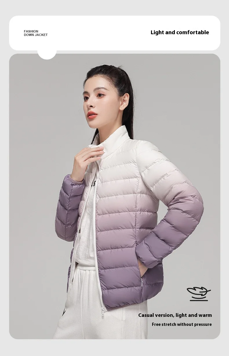 2024 Women’s Light Down Puffer Jacket Hooded Stand Collar Gradient Short Coat Fashionable Autumn Winter Warm Duck Clothing