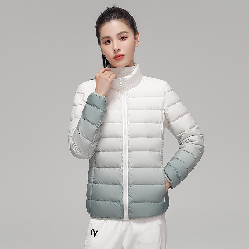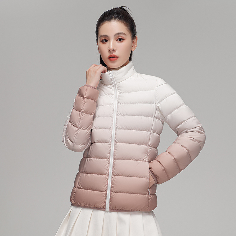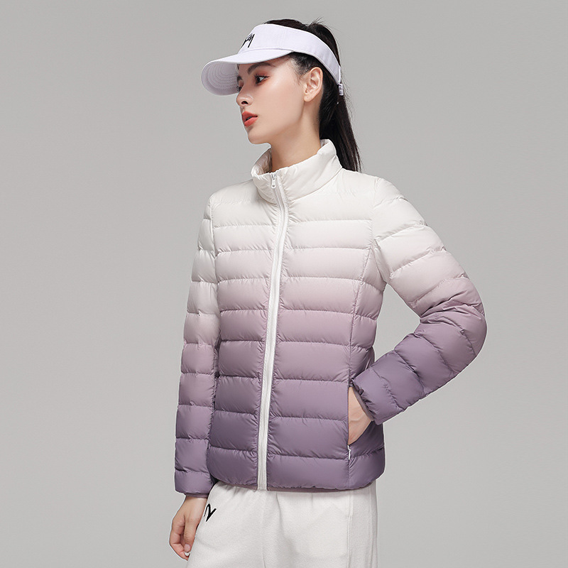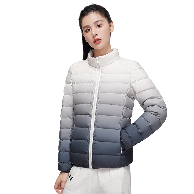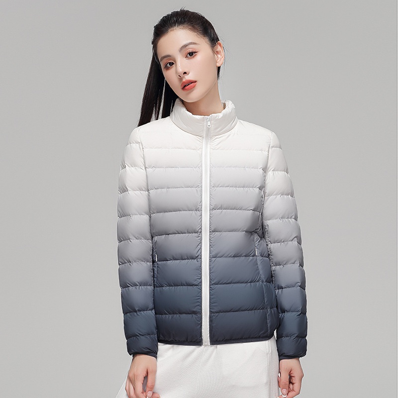 2024 Women’s Light Down Puffer Jacket Hooded Stand Collar Gradient Short Coat Fashionable Autumn Winter Warm Duck Clothing