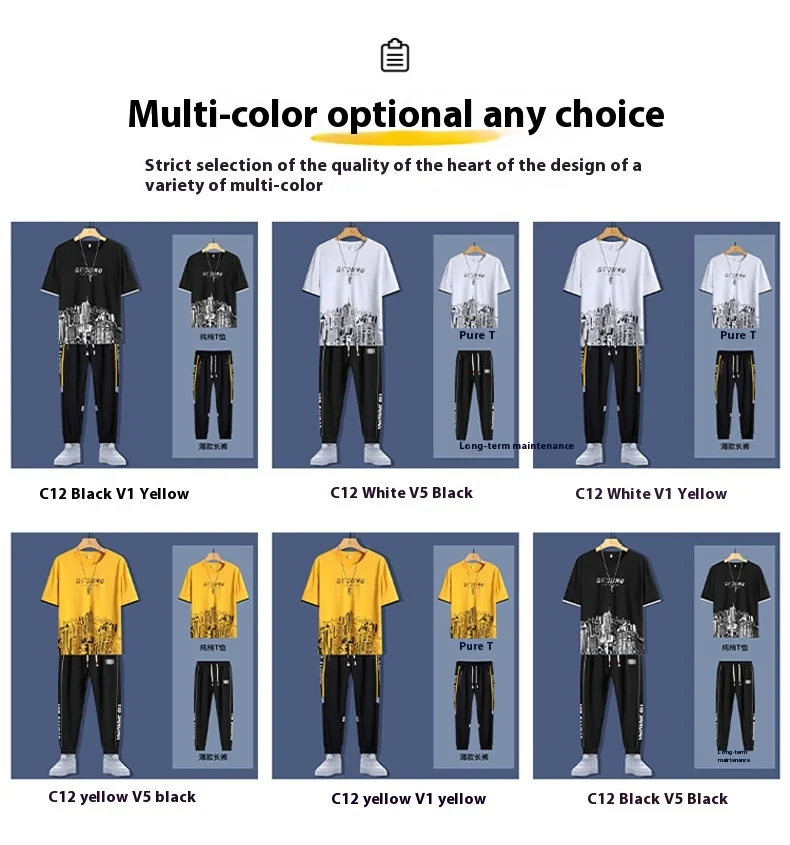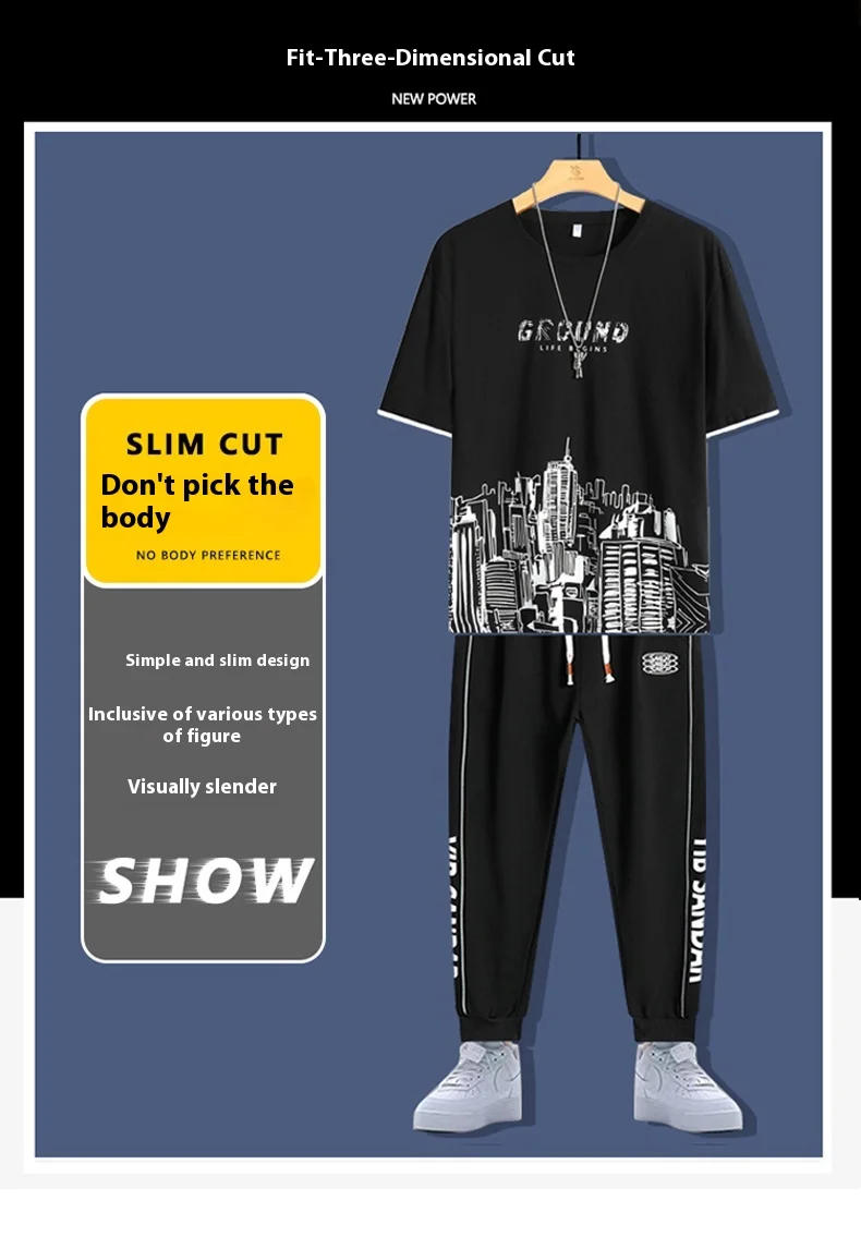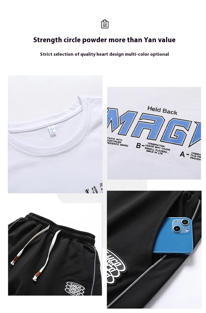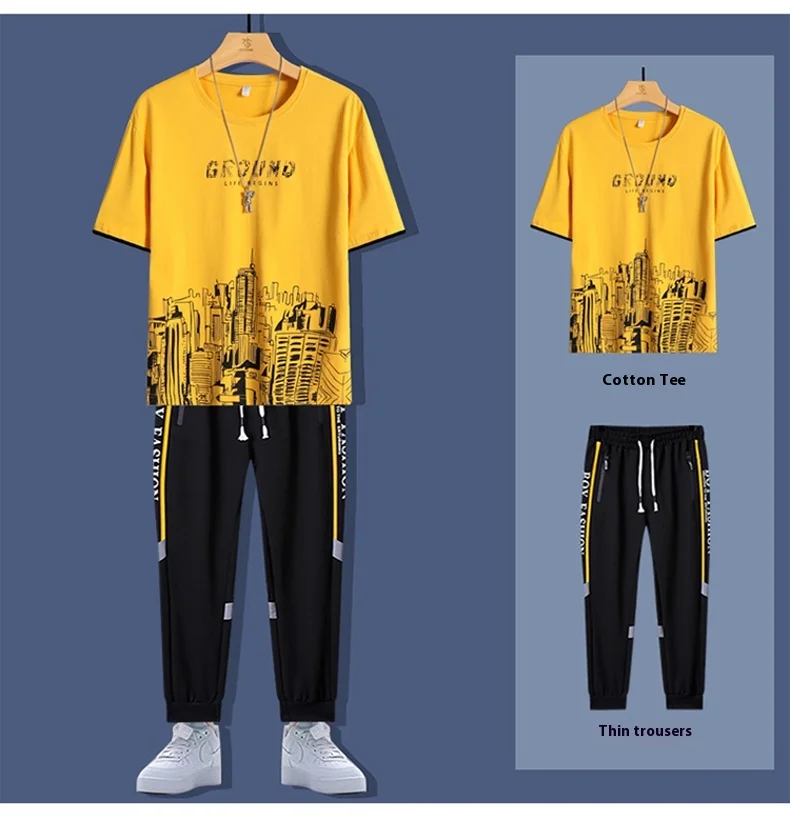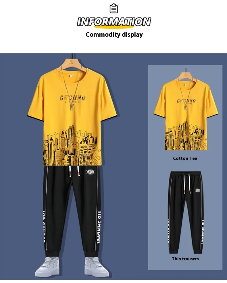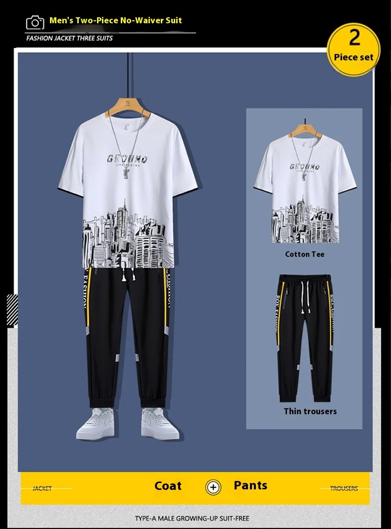 2025 Summer New Fashion Men’s T-shirt Sets Young Cotton Casual O-Neck Short Sleeves 220 Grams Knitted Fabric Printed Loose Fit