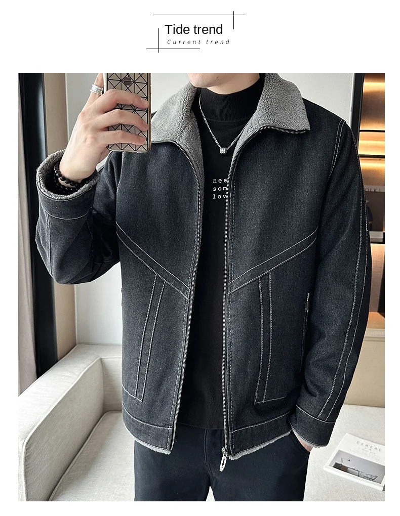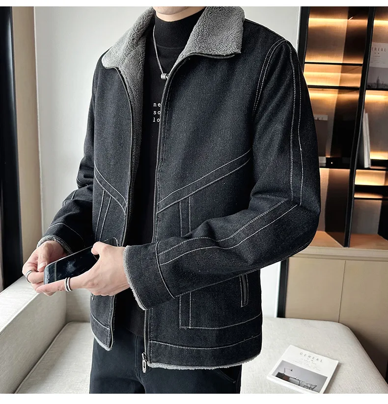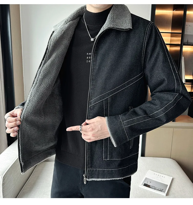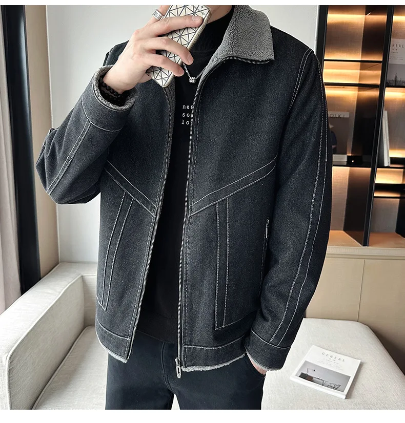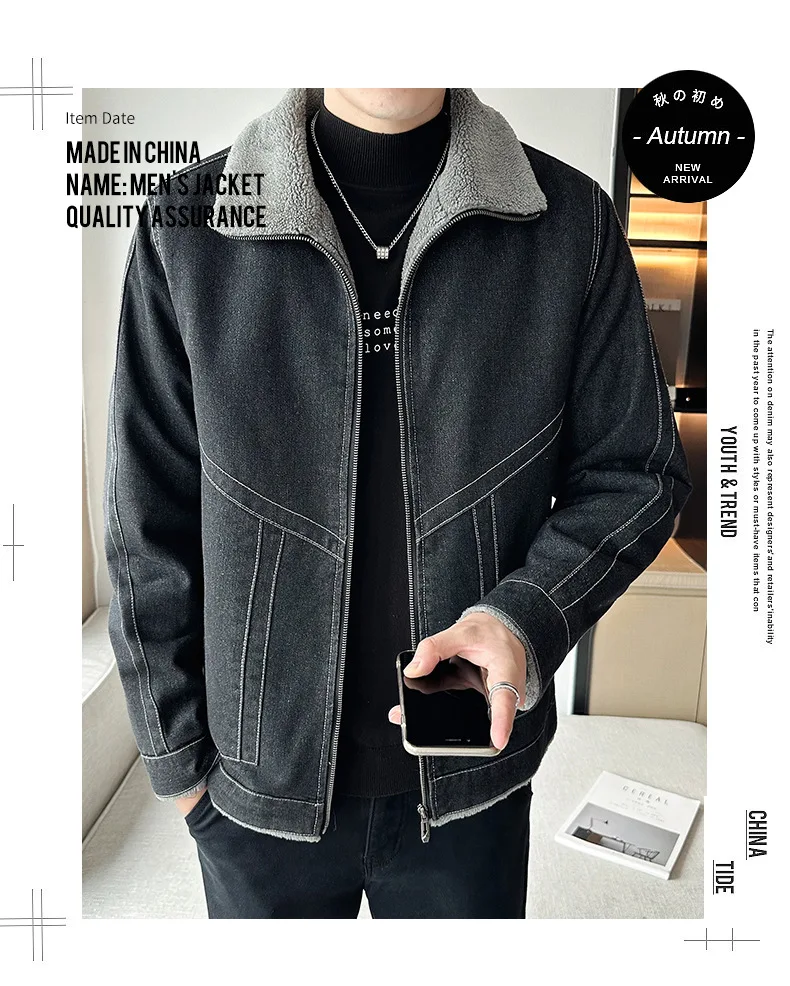 Autumn Winter Men’s Casual Fleece Jacket Thickened Korean Lapel Design with Zipper Closure Factory Direct Supply Denim Fabric