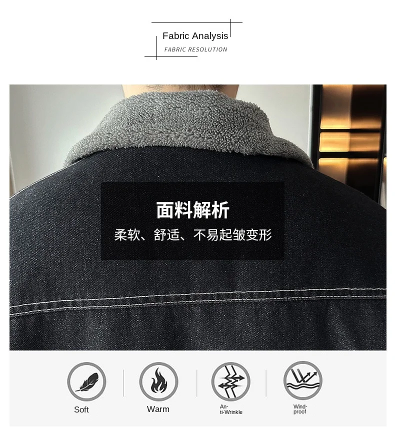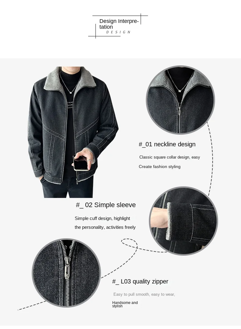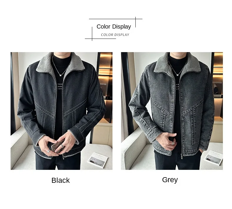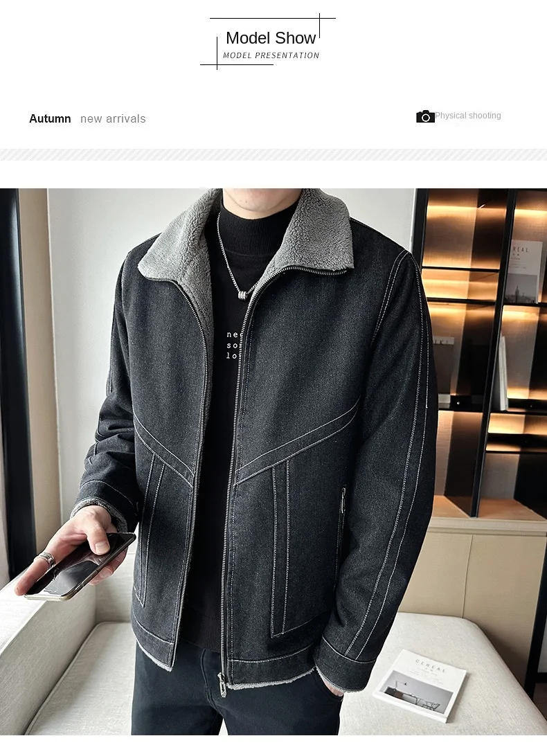 Autumn Winter Men’s Casual Fleece Jacket Thickened Korean Lapel Design with Zipper Closure Factory Direct Supply Denim Fabric