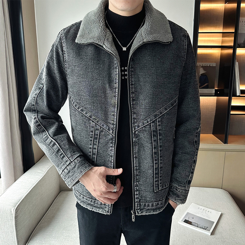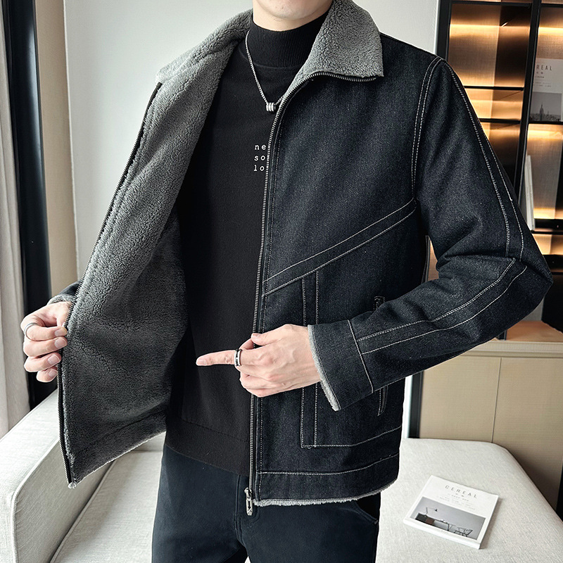 Autumn Winter Men’s Casual Fleece Jacket Thickened Korean Lapel Design with Zipper Closure Factory Direct Supply Denim Fabric