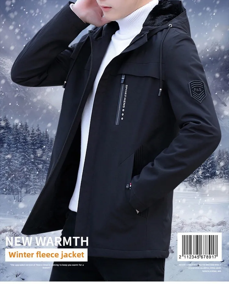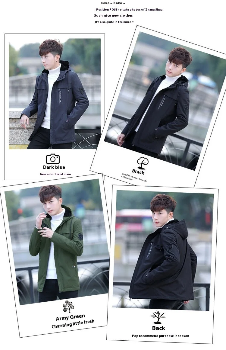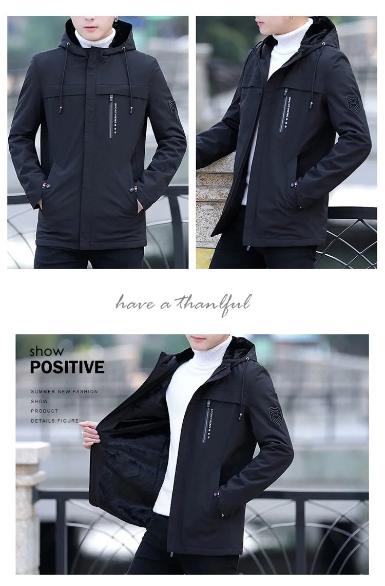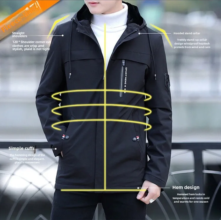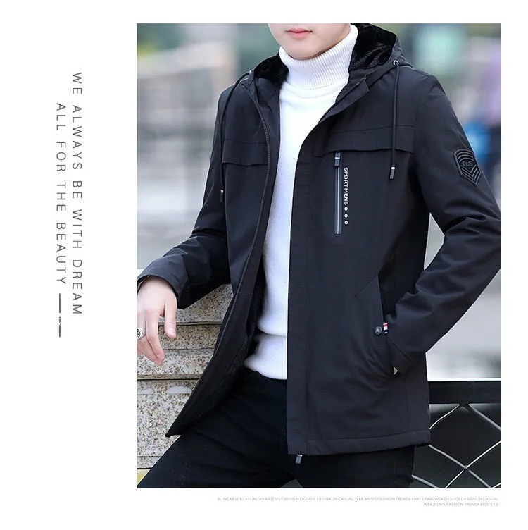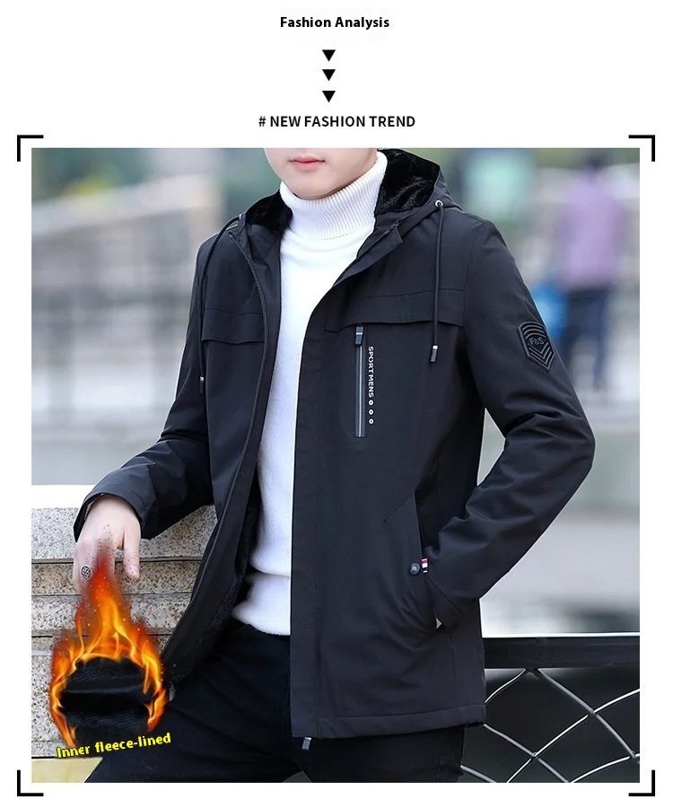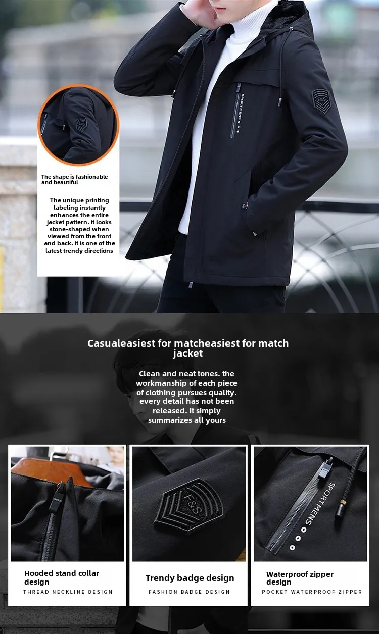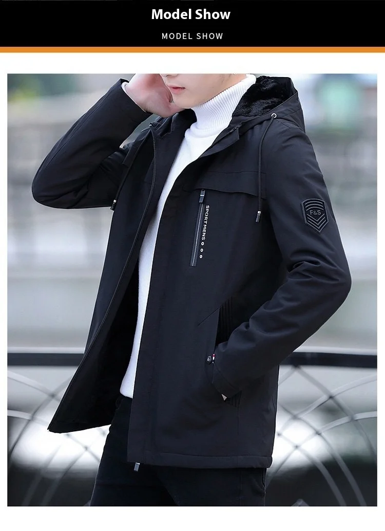 Blue Hooded Lapel Jacket for Youth Winter Motorcycle Zipper Closure with Side Seam Pocket Thickened Spring Fall Use Men’s Jacket