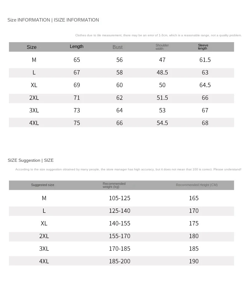 | Size | M, L, XL, 2XL, 3XL, 4XL |