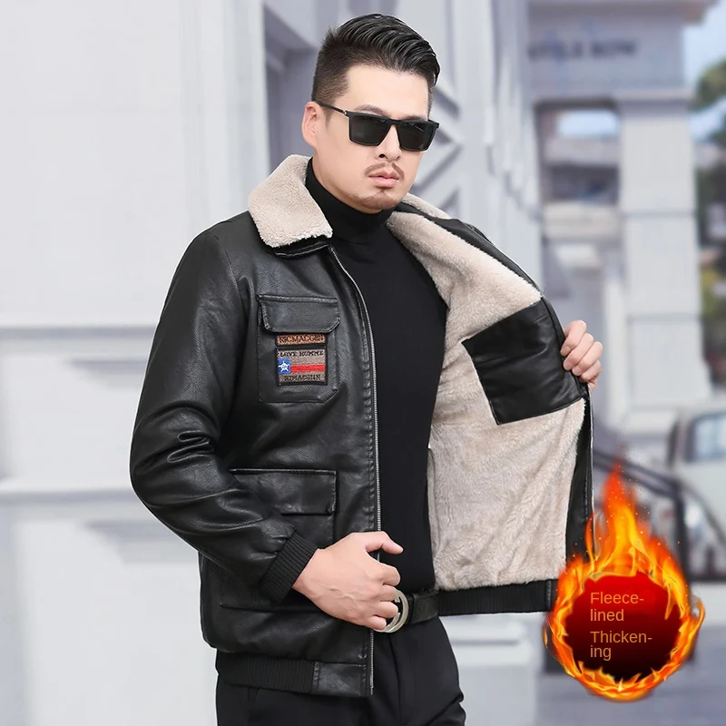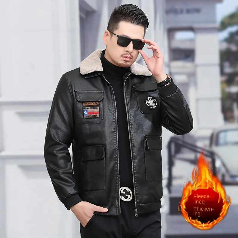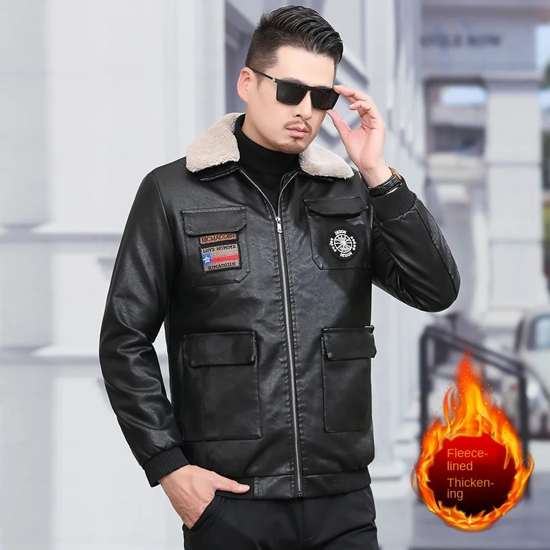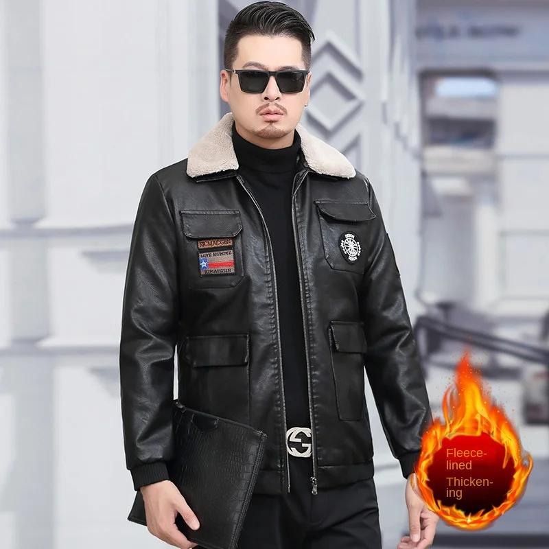 European Station’s Popular Men’s Winter Jacket Thickened Fleece-Lined Leather Coat Large Embroidery ODM All Sizes for