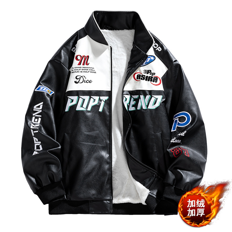 European Trendy Winter Casual Pilot Long Leather Jacket for Men Thickened Warm Stand Collar Large Embroidery Clearance Foreign