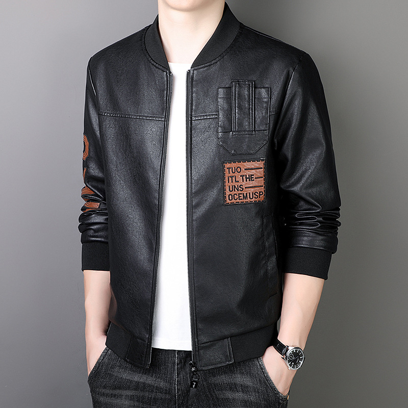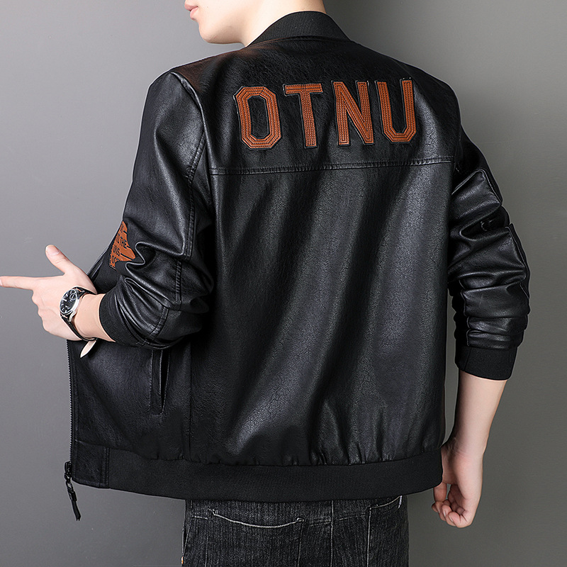 Korean Fashion Brand Men’s PU Leather Motorcycle Jacket ODM Supply Embroidered Business Figure Design Shirt Style