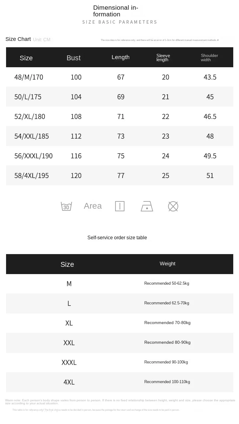 2xl/185 (recommended 80.00 kg-90.00 kg, 3xl/190 (90.00 kg-100.00 kg recommended, 4xl/195 (recommended 100.00 kg-105.00 kg, L/175 (62.50 kg-70.00 kg recommended, M/170 (recommendation 50.00 kg-62.50 kg, Xl/180 (70.00 kg-80.00 kg recommended