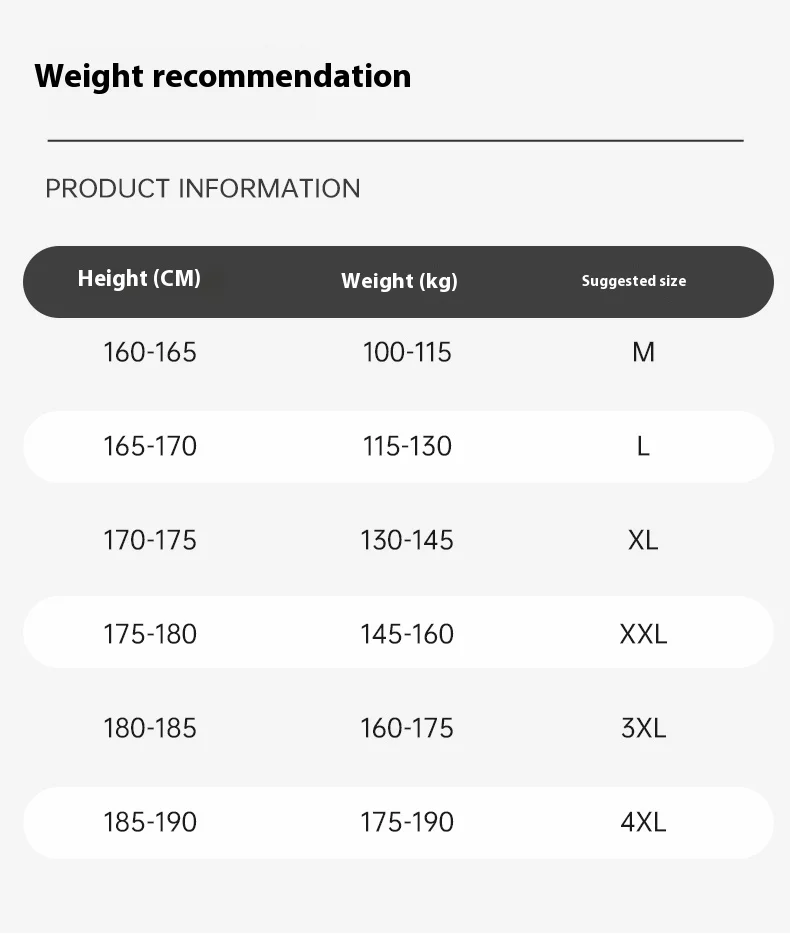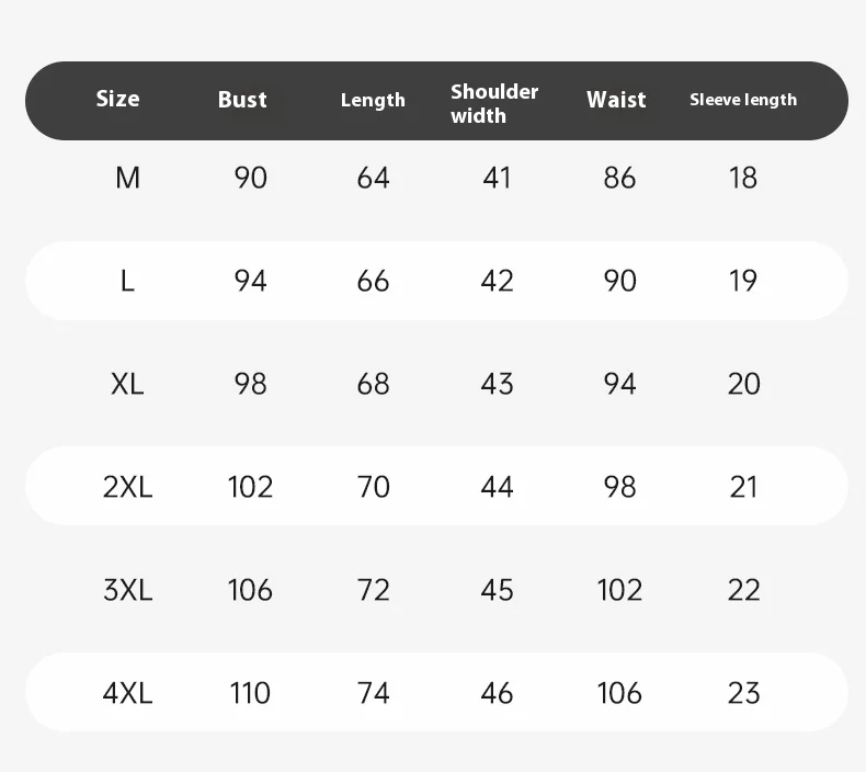 | Size | M, L, XL, 2XL, 3XL, 4XL |