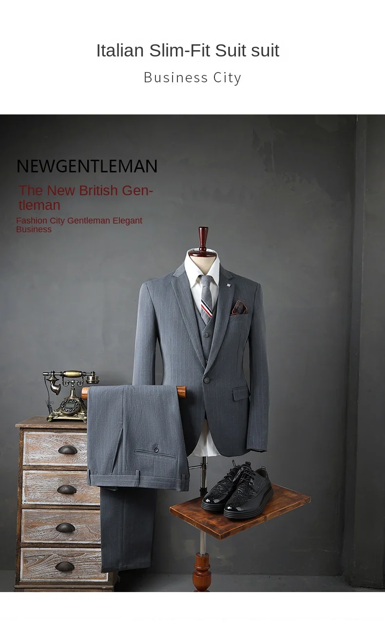 Men’s British Style Two-Piece Slim Fit Groom Suit Zipper Fly Pants Single Breasted Wedding Casual Business Dress Set Office Wear