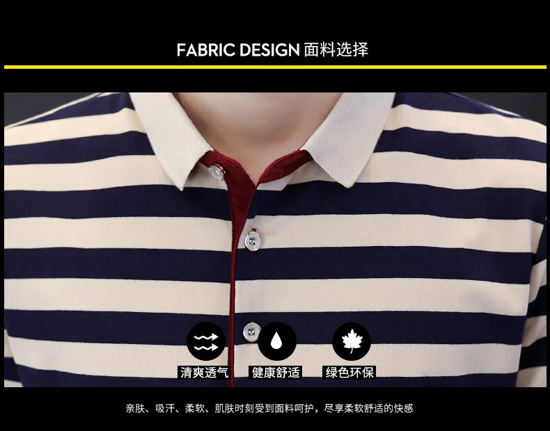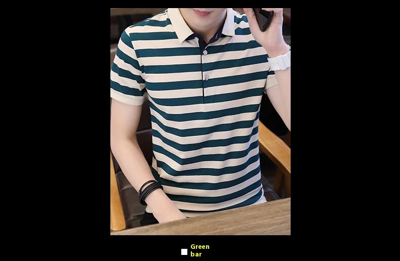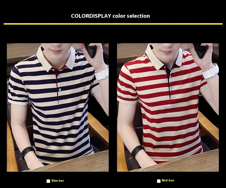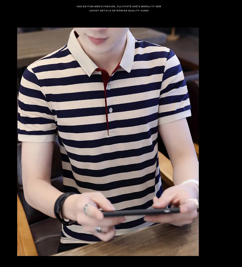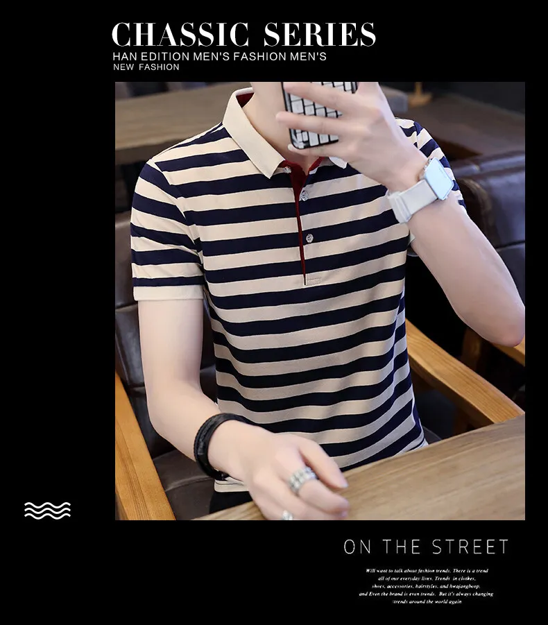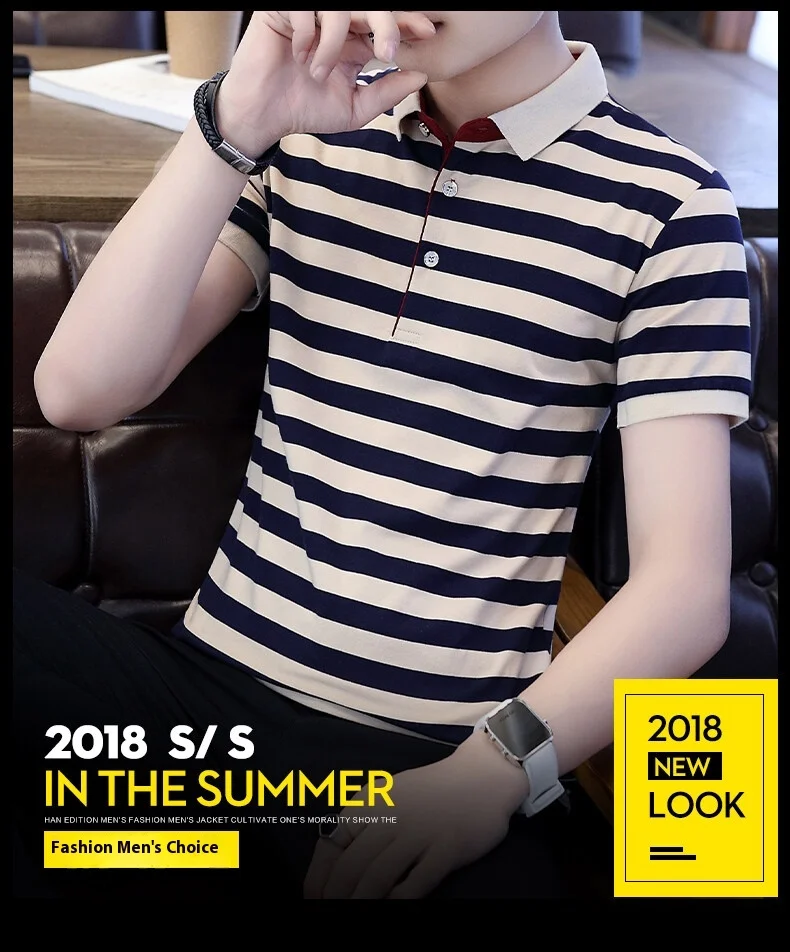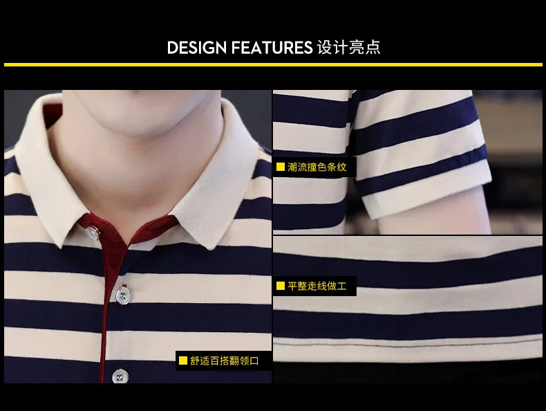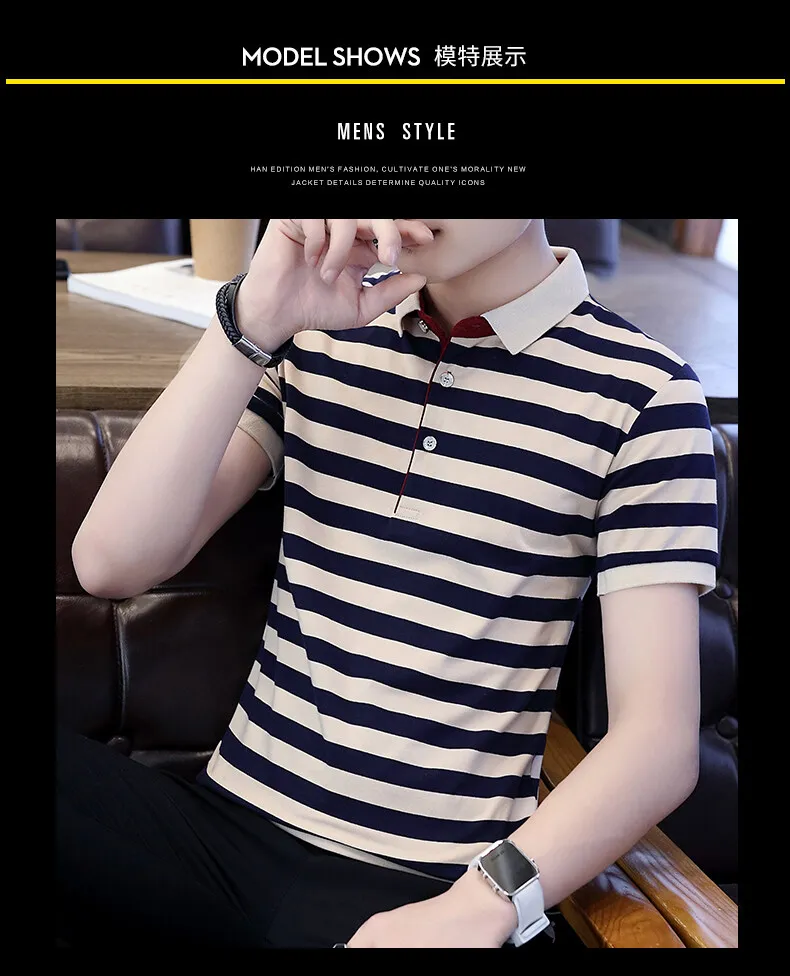 Men’s European Style Summer Polo Shirt Striped Pure Cotton Slim-Fit Short-Sleeved T-Shirt Fashionable Lapel Design Sea Soul Plus