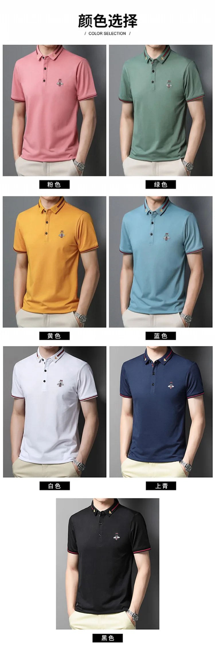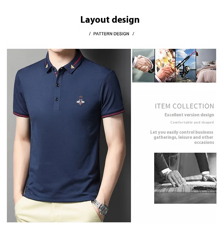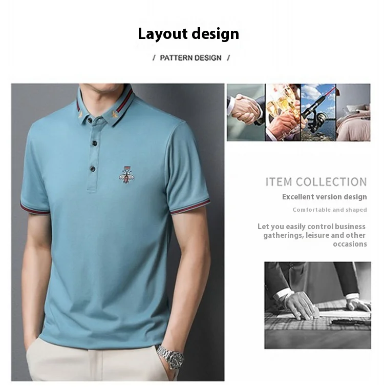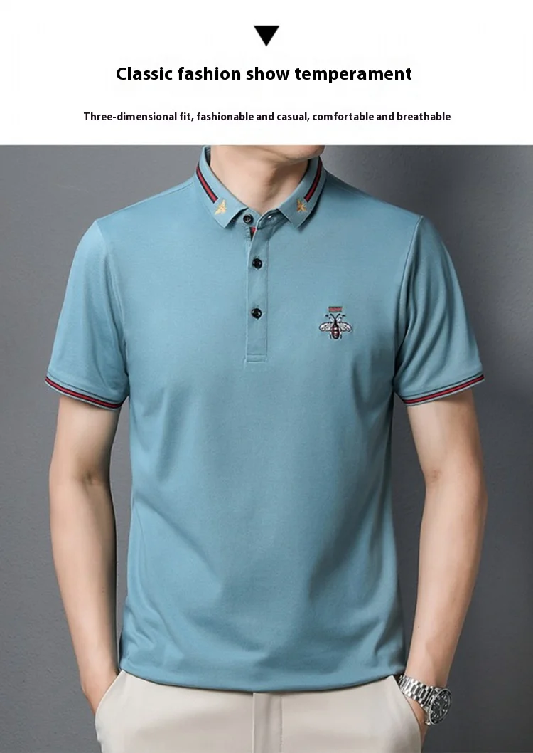 Men’s Half-Sleeved Bee Lapel for Polo Shirt Youth Business Style Made Mercerized Cotton Solid Color Loose Fit Anti-Pilling Knitt