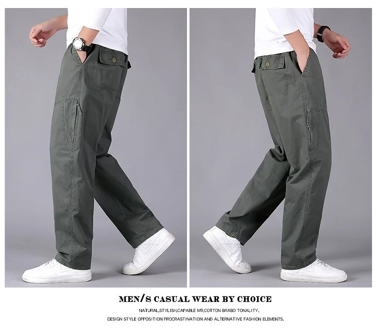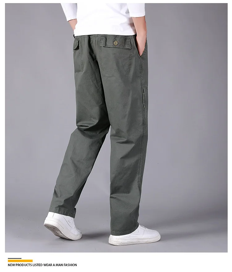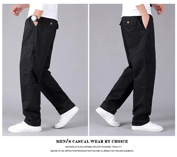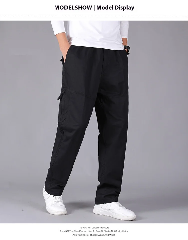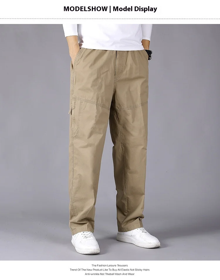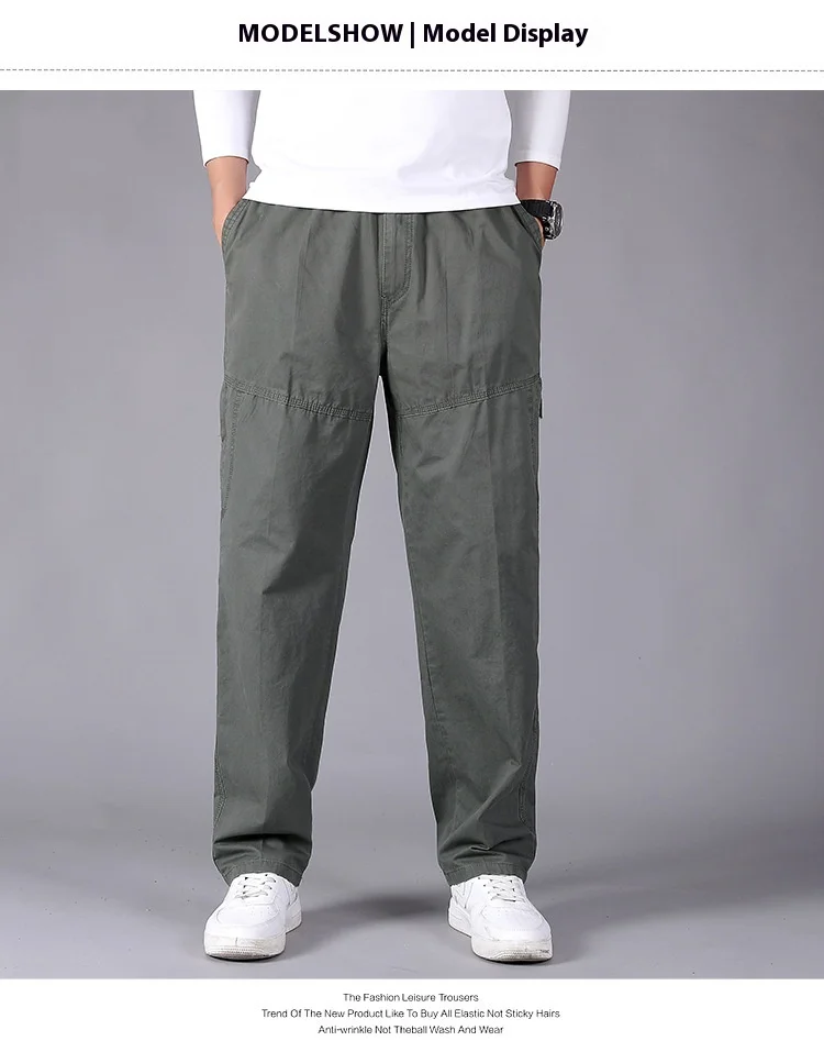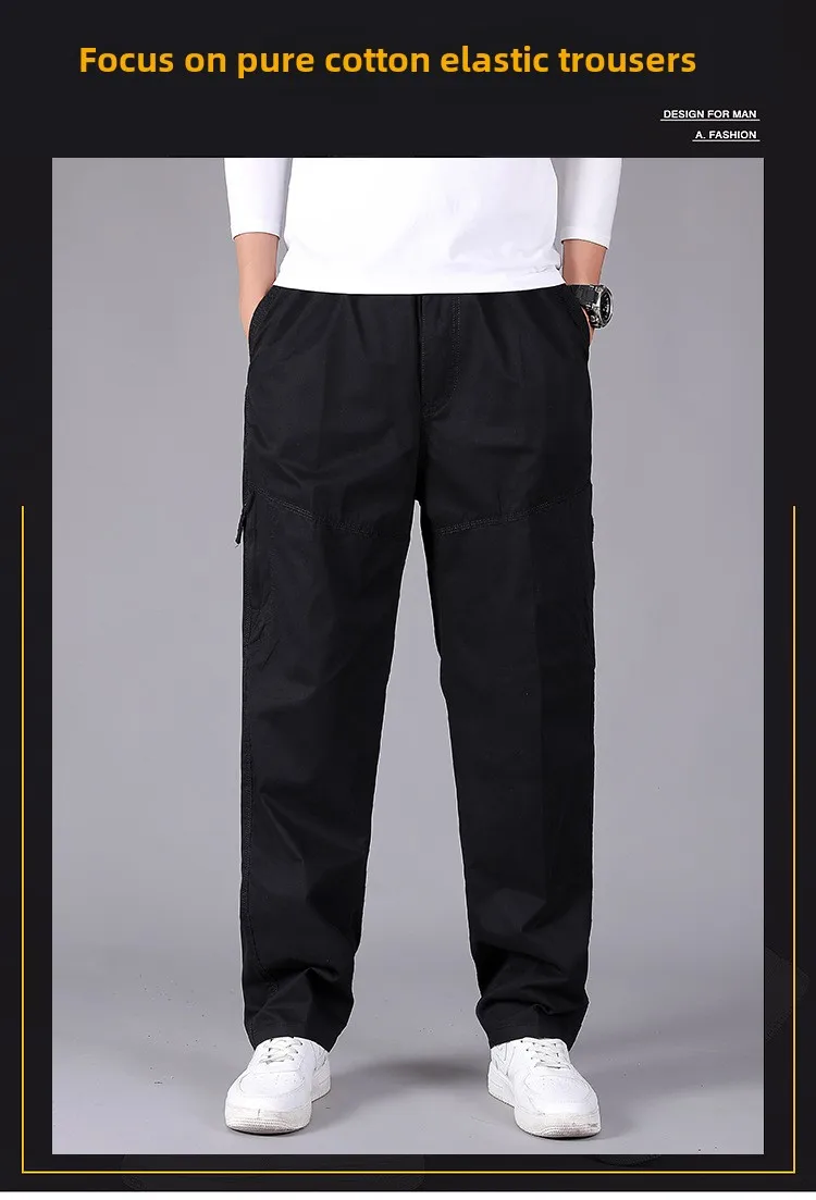 Men’s Plus Size Casual Straight-Leg Cotton Pants Mid-Waist Elastic Logo Comfortable Loose Fit Dark Look for Office Flat Workwear