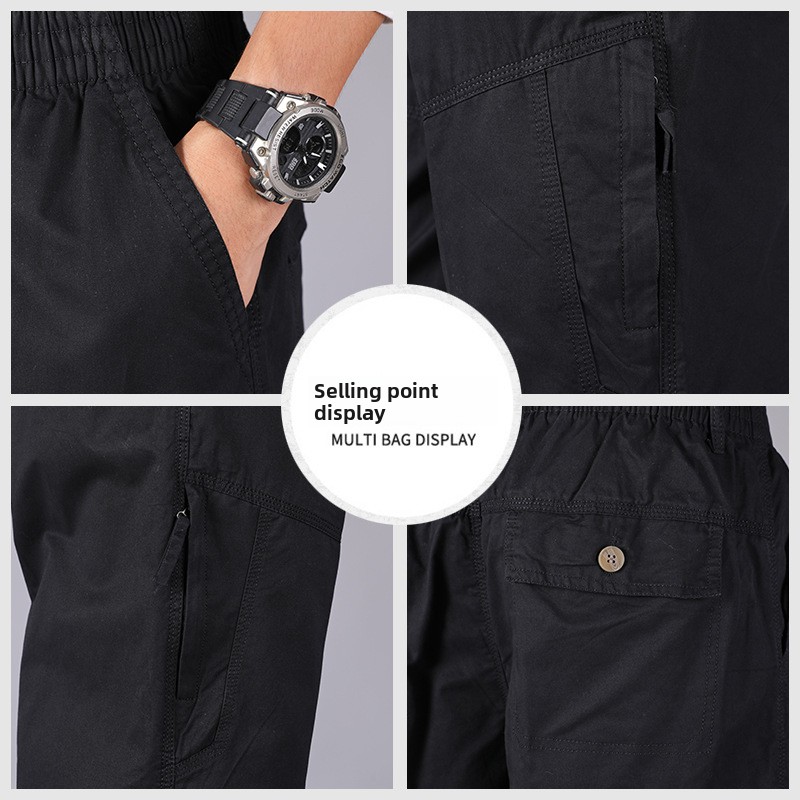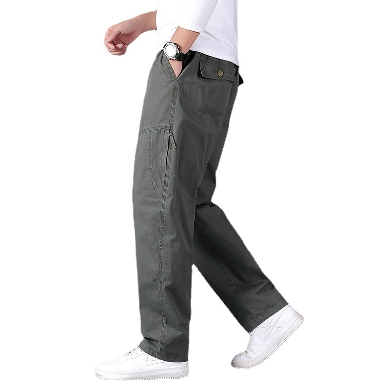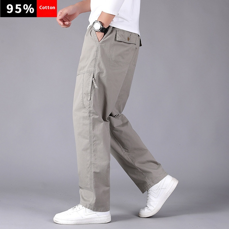 Men’s Plus Size Casual Straight-Leg Cotton Pants Mid-Waist Elastic Logo Comfortable Loose Fit Dark Look for Office Flat Workwear