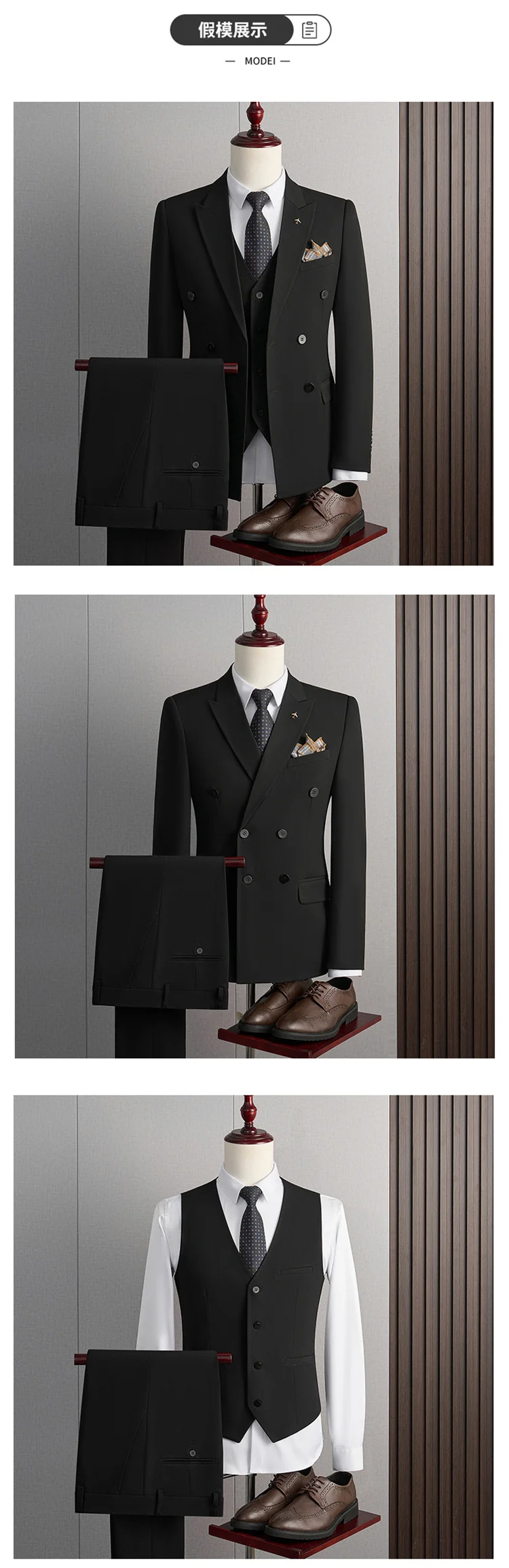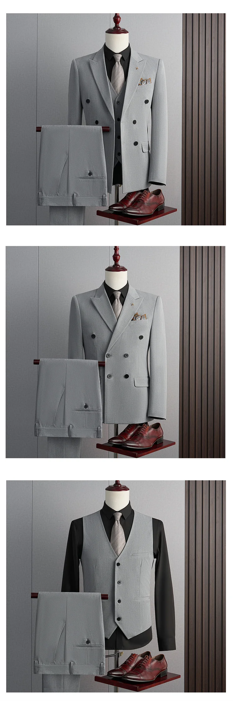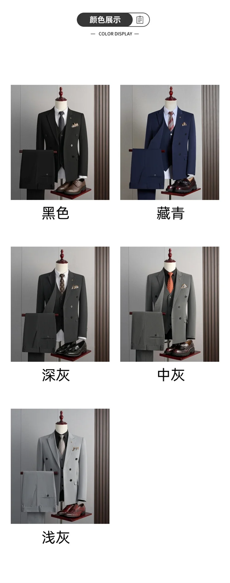 | Color | Black Three-piece set, Black two-piece, Blue Three-piece set, Blue two-piece, Dark gray Three-piece set, Dark gray two-piece, Light gray Three-piece set, Light gray two-piece, Medium grey Three-piece set, Medium grey two-piece |