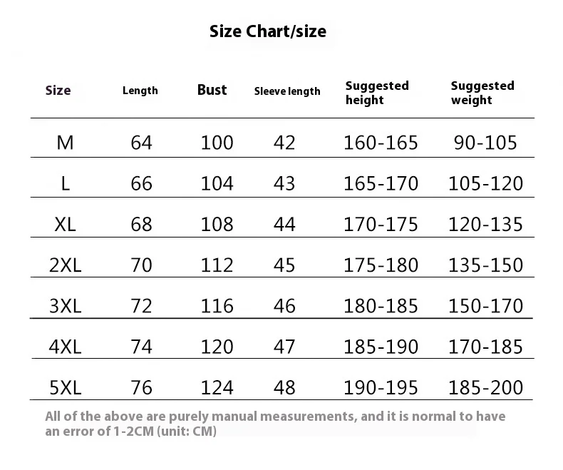 M, L, XL, 2XL, 3XL, 4XL, 5XL