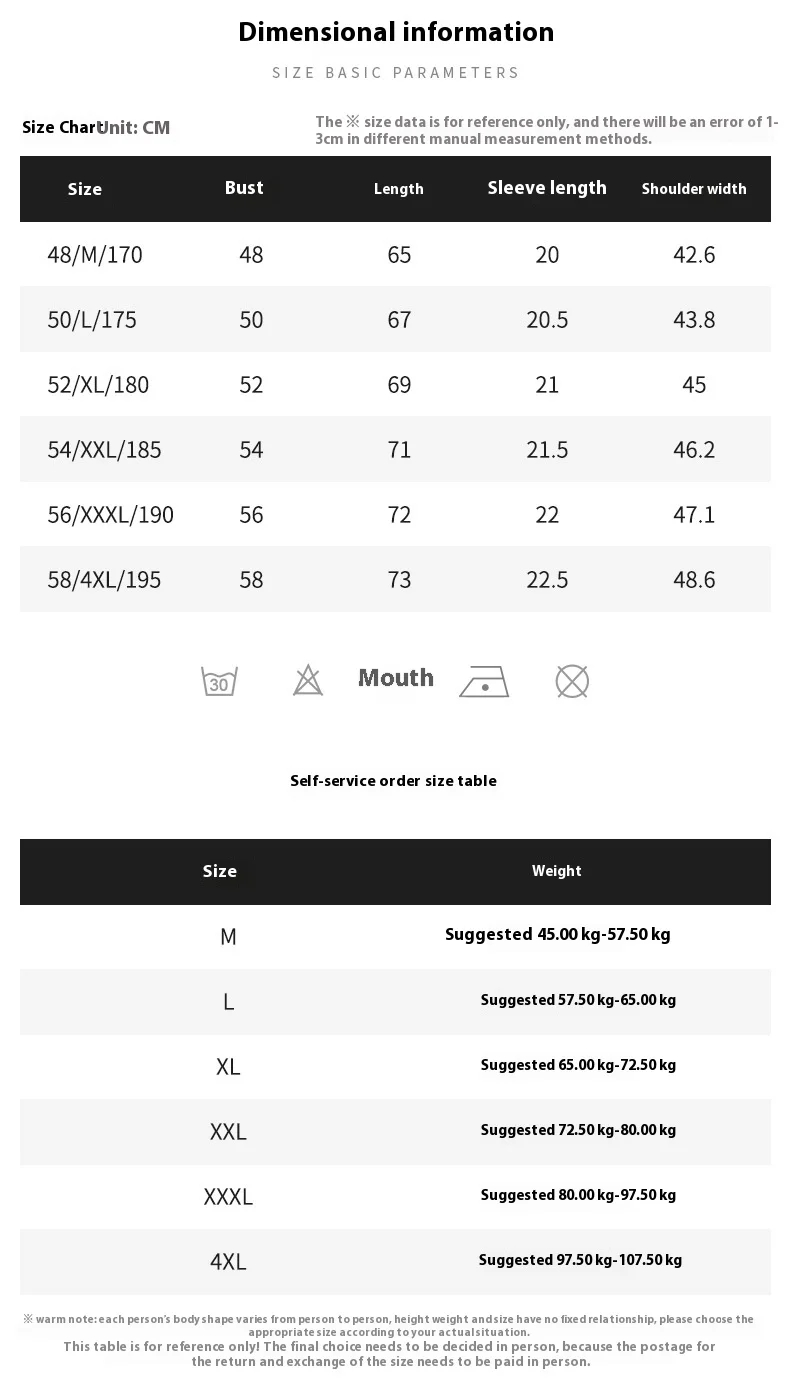 | Size | L/175 (recommended weight 60-70kg ), M/170 (recommended weight 50-60kg ), Xl/180 (recommended weight 70-80kg ), Xxl/185 (recommended weight 80-87.5kg ), Xxxl/190 (recommended weight 87.5-95kg ), Xxxxl4xl/195 (recommended weight 95-105kg ) |