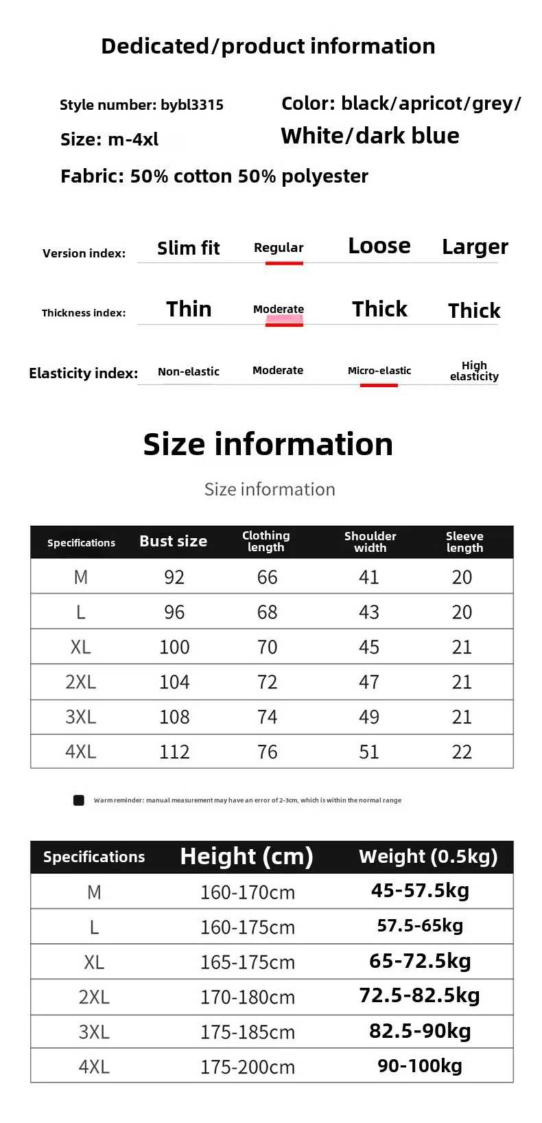 | Size | M, L, XL, 2XL, 3XL, 4XL |