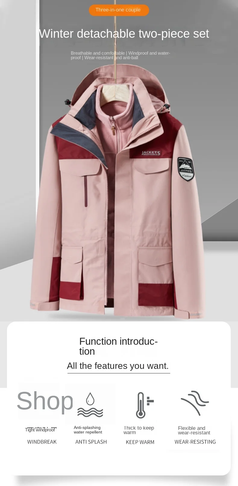Free Shipping on Trendy Unisex Three-in-One Detachable Winter Jacket Windproof Waterproof Outdoor Clothing Men Women Long Design