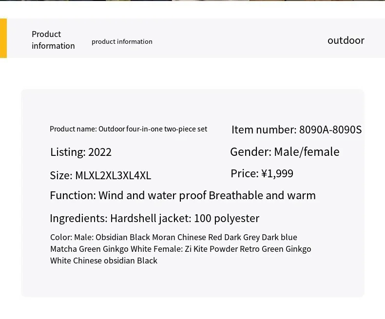 • Unisex New Couple’s Assault Outdoor Sports Jacket Zipper Closure Two-Piece Suit Factory Direct Printable Logo for Adults