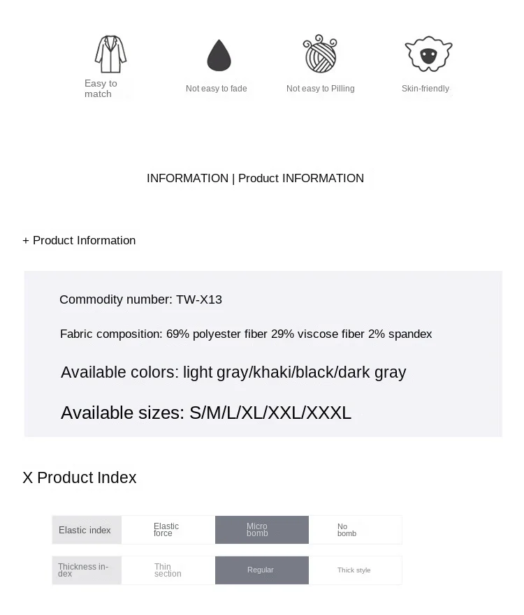 Black (jacket pants), Dark gray (jacket pants), Khaki (jacket pants), Light gray (jacket pants)